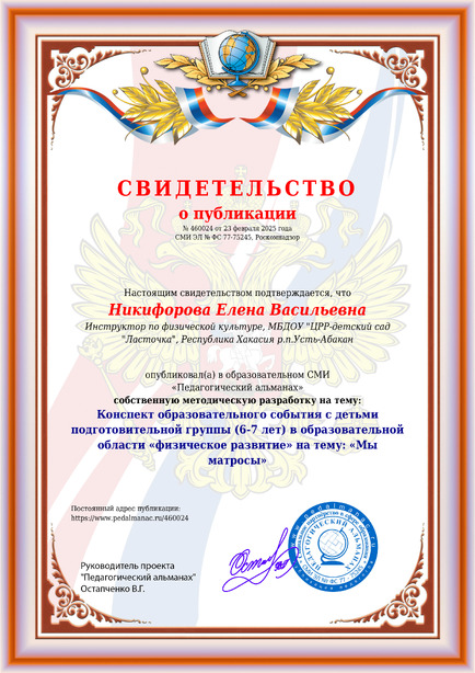 Никифорова Елена Васильевна Конспект образовательного события с детьми подготовительной группы (6-7 лет) в образовательной области «физическое развитие» на тему: «Мы матросы» / Е. В. Никифорова. – Текст : электронный // Педагогический альманах : электронное СМИ. - URL: https://www.pedalmanac.ru/460024. - Дата публикации: 23 февраля 2025.
