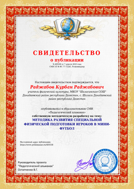 Раджабов, К. Р. МЕТОДИКА РАЗВИТИЯ СПЕЦИАЛЬНОЙ ФИЗИЧЕСКОЙ ПОДГОТОВКИ ИГРОКОВ В МИНИ-ФУТБОЛ [Электронный ресурс] / Курбан Раджабович Раджабов // Педагогический альманах : [сайт]. - 2025. - 7 апреля. - [Россия]. - Режим доступа: https://www.pedalmanac.ru/469508, свободный. - Загл. с экрана.