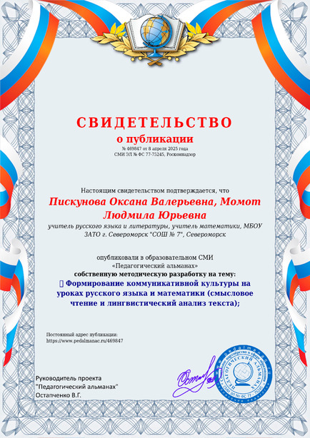 Пискунова Оксана Валерьевна, Момот Людмила Юрьевна Формирование коммуникативной культуры на уроках русского языка и математики (смысловое чтение и лингвистический анализ текста); / О. В. Пискунова. – Текст : электронный // Педагогический альманах : электронное СМИ. - URL: https://www.pedalmanac.ru/469847. - Дата публикации: 8 апреля 2025.