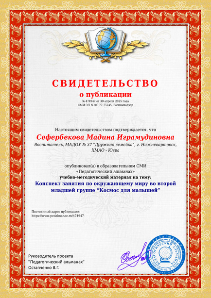 Cефербекова Мадина Играмудиновна Конспект занятия по окружающему миру во второй младшей группе “Космос для малышей” / М. И. Cефербекова. – Текст : электронный // Педагогический альманах : электронное СМИ. - URL: https://www.pedalmanac.ru/474947. - Дата публикации: 30 апреля 2025.
