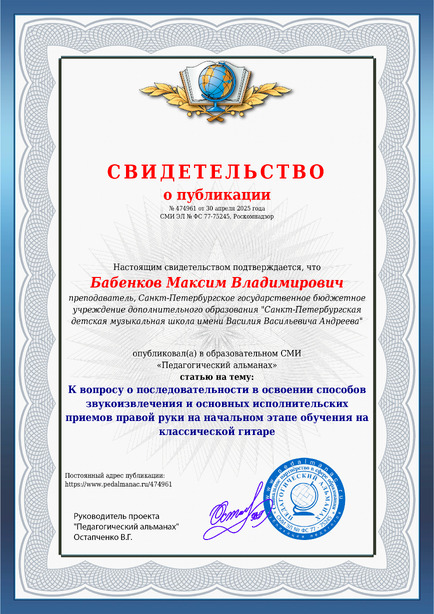 Бабенков Максим Владимирович К вопросу о последовательности в освоении способов звукоизвлечения и основных исполнительских приемов правой руки на начальном этапе обучения на классической гитаре / М. В. Бабенков. – Текст : электронный // Педагогический альманах : электронное СМИ. - URL: https://www.pedalmanac.ru/474961. - Дата публикации: 30 апреля 2025.