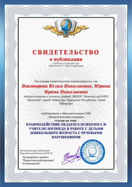 Викторова Юлия Николаевна, Юрина Ирина Николаевна ВЗАИМОДЕЙСТВИЕ ПЕДАГОГА-ПСИХОЛОГА И УЧИТЕЛЯ-ЛОГОПЕДА В РАБОТЕ С ДЕТЬМИ ДОШКОЛЬНОГО ВОЗРАСТА С РЕЧЕВЫМИ НАРУШЕНИЯМИ / Ю. Н. Викторова. – Текст : электронный // Педагогический альманах : электронное СМИ. - URL: https://www.pedalmanac.ru/478778. - Дата публикации: 19 мая 2025.