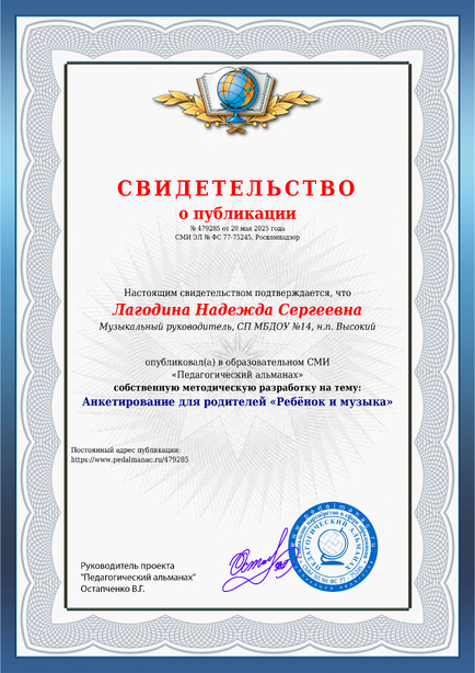 Лагодина Надежда Сергеевна Анкетирование для родителей «Ребёнок и музыка» / Н. С. Лагодина. – Текст : электронный // Педагогический альманах : электронное СМИ. - URL: https://www.pedalmanac.ru/479285. - Дата публикации: 20 мая 2025.