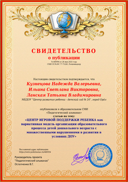 Кузнецова Надежда Валерьевна, Ильина Светлана Викторовна, Ланская Татьяна Владимировна «ЦЕНТР ИГРОВОЙ ПОДДЕРЖКИ РЕБЕНКА как вариативная модель организации образовательного процесса детей дошкольного возраста с множественными нарушениями в развитии в условиях ДОУ» / Н. В. Кузнецова. – Текст : электронный // Педагогический альманах : электронное СМИ. - URL: https://www.pedalmanac.ru/480994. - Дата публикации: 26 мая 2025.
