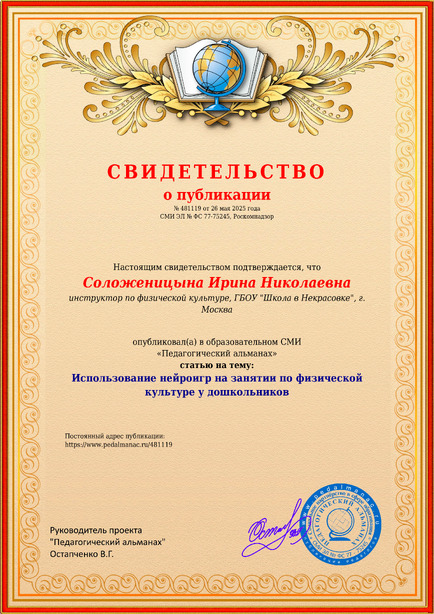 Соложеницына Ирина Николаевна Использование нейроигр на занятии по физической культуре у дошкольников / И. Н. Соложеницына. – Текст : электронный // Педагогический альманах : электронное СМИ. - URL: https://www.pedalmanac.ru/481119. - Дата публикации: 26 мая 2025.