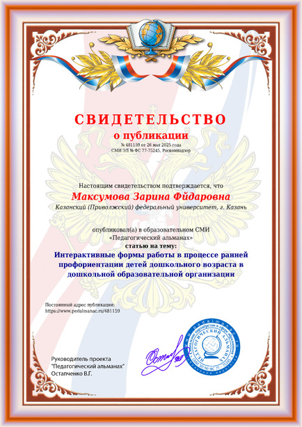 Максумова Зарина Фйдаровна Интерактивные формы работы в процессе ранней профориентации детей дошкольного возраста в дошкольной образовательной организации / З. Ф. Максумова. – Текст : электронный // Педагогический альманах : электронное СМИ. - URL: https://www.pedalmanac.ru/481159. - Дата публикации: 26 мая 2025.