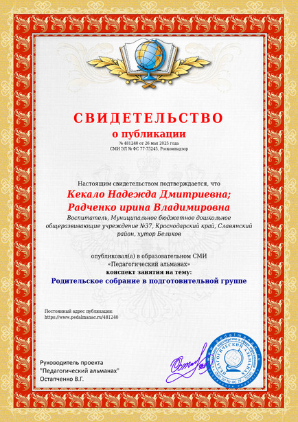 Кекало Надежда Дмитриевна; Радченко ирина Владимировна Родительское собрание в подготовительной группе / Н. Д. Кекало. – Текст : электронный // Педагогический альманах : электронное СМИ. - URL: https://www.pedalmanac.ru/481240. - Дата публикации: 26 мая 2025.