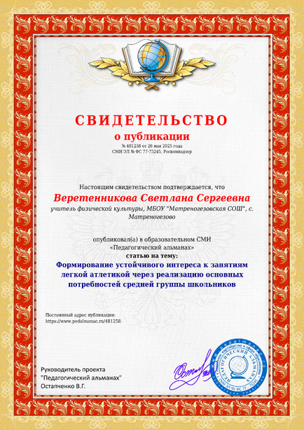 Веретенникова Светлана Сергеевна Формирование устойчивого интереса к занятиям легкой атлетикой через реализацию основных потребностей средней группы школьников / С. С. Веретенникова. – Текст : электронный // Педагогический альманах : электронное СМИ. - URL: https://www.pedalmanac.ru/481258. - Дата публикации: 26 мая 2025.