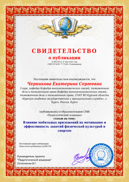 Черникова Екатерина Сергеевна Влияние мобильных приложений на мотивацию и эффективность занятий физической культурой и спортом / Е. С. Черникова. – Текст : электронный // Педагогический альманах : электронное СМИ. - URL: https://www.pedalmanac.ru/481559. - Дата публикации: 27 мая 2025.