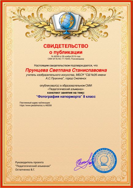 После оплаты Вам моментально предоставляется именное «Свидетельство о публикации» и «Справка о публикации материала в СМИ»В соответствии с пп. 36, 37 Приказа Минобрнауки РФ №276 «Об утверждении Порядка проведения аттестации педагогических работников» является подтверждением транслирования в педагогических коллективах опыта практических результатов своей профессиональной деятельности, в том числе экспериментальной и инновационной. установленного образца в печатном качестве, которые Вы можете приложить к портфолио и предъявить при прохождении аттестации.