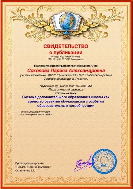 После оплаты Вам моментально предоставляется именное «Свидетельство о публикации» и «Справка о публикации материала в СМИ»В соответствии с пп. 36, 37 Приказа Минобрнауки РФ №276 «Об утверждении Порядка проведения аттестации педагогических работников» является подтверждением транслирования в педагогических коллективах опыта практических результатов своей профессиональной деятельности, в том числе экспериментальной и инновационной. установленного образца в печатном качестве, которые Вы можете приложить к портфолио и предъявить при прохождении аттестации.