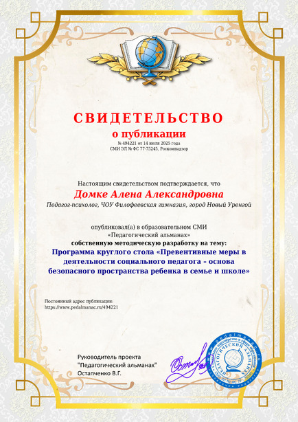 Домке Алена Александровна Программа круглого стола «Превентивные меры в деятельности социального педагога – основа безопасного пространства ребенка в семье и школе» / А. А. Домке. – Текст : электронный // Педагогический альманах : электронное СМИ. - URL: https://www.pedalmanac.ru/494221. - Дата публикации: 14 июля 2025.