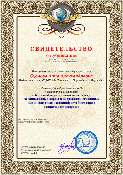 Суслова Анна Александровна Ассоциативные карты в коррекции негативных эмоциональных состояний детей старшего дошкольного возраста / А. А. Суслова. – Текст : электронный // Педагогический альманах : электронное СМИ. - URL: https://www.pedalmanac.ru/494304. - Дата публикации: 15 июля 2025.