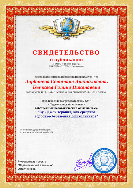 Дербенева Светлана Анатольевна, Бычкова Галина Николаевна “Су – Джок терапия, как средство здоровьесбережения дошкольников” / С. А. Дербенева. – Текст : электронный // Педагогический альманах : электронное СМИ. - URL: https://www.pedalmanac.ru/494370. - Дата публикации: 15 июля 2025.