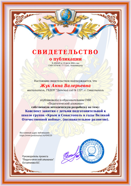 Жук Анна Валерьевна Конспект занятия с детьми подготовительной к школе группе «Крым и Севастополь в годы Великой Отечественной войны». (познавательное развитие). / А. В. Жук. – Текст : электронный // Педагогический альманах : электронное СМИ. - URL: https://www.pedalmanac.ru/494529. - Дата публикации: 16 июля 2025.