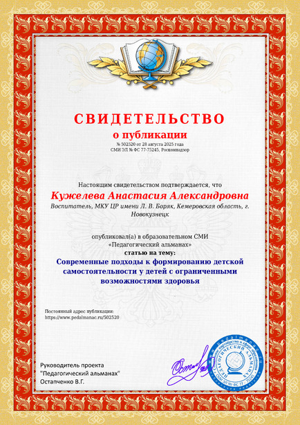 Кужелева Анастасия Александровна Современные подходы к формированию детской самостоятельности у детей с ограниченными возможностями здоровья / А. А. Кужелева. – Текст : электронный // Педагогический альманах : электронное СМИ. - URL: https://www.pedalmanac.ru/502520. - Дата публикации: 28 августа 2025.