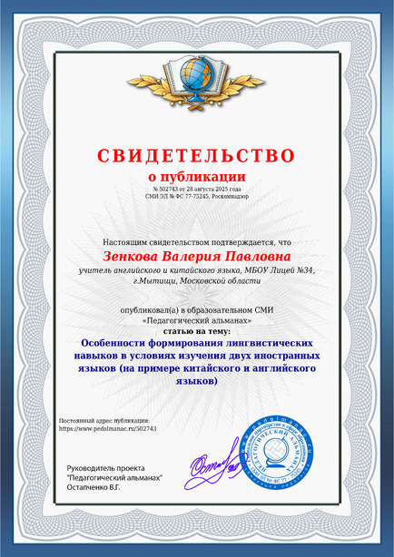 Зенкова Валерия Павловна Особенности формирования лингвистических навыков в условиях изучения двух иностранных языков (на примере китайского и английского языков) / В. П. Зенкова. – Текст : электронный // Педагогический альманах : электронное СМИ. - URL: https://www.pedalmanac.ru/502743. - Дата публикации: 28 августа 2025.