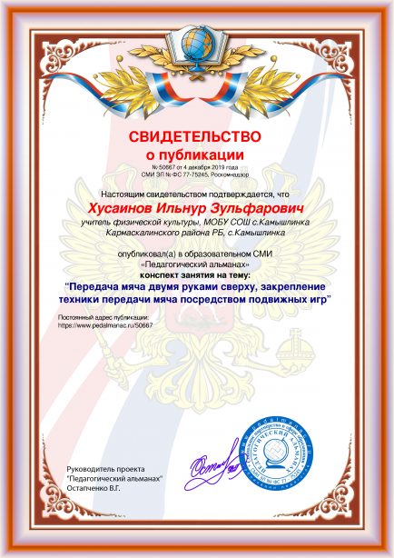 После оплаты Вам моментально предоставляется именное «Свидетельство о публикации» и «Справка о публикации материала в СМИ»В соответствии с пп. 36, 37 Приказа Минобрнауки РФ №276 «Об утверждении Порядка проведения аттестации педагогических работников» является подтверждением транслирования в педагогических коллективах опыта практических результатов своей профессиональной деятельности, в том числе экспериментальной и инновационной. установленного образца в печатном качестве, которые Вы можете приложить к портфолио и предъявить при прохождении аттестации.