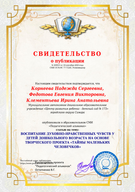 Корнеева Надежда Сергеевна, Федотова Евгения Викторовна, Клементьева Ирина Анатольевна ВОСПИТАНИЕ ДУХОВНО-НРАВСТВЕННЫХ ЧУВСТВ У ДЕТЕЙ ДОШКОЛЬНОГО ВОЗРАСТА НА ОСНОВЕ ТВОРЧЕСКОГО ПРОЕКТА «ТАЙНЫ МАЛЕНЬКИХ ЧЕЛОВЕЧКОВ» / Н. С. Корнеева. – Текст : электронный // Педагогический альманах : электронное СМИ. - URL: https://www.pedalmanac.ru/509013. - Дата публикации: 18 сентября 2025.