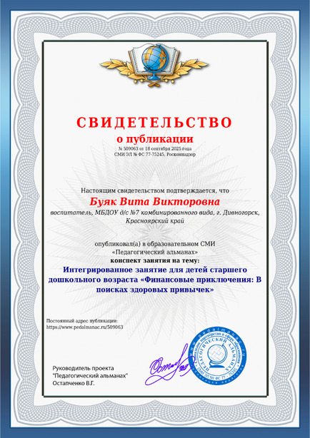 Буяк, В. В. Интегрированное занятие для детей старшего дошкольного возраста «Финансовые приключения: В поисках здоровых привычек» [Электронный ресурс] / Вита Викторовна Буяк // Педагогический альманах : [сайт]. - 2025. - 18 сентября. - [Россия]. - Режим доступа: https://www.pedalmanac.ru/509063, свободный. - Загл. с экрана.