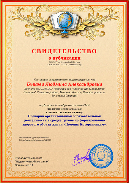 Быкова Людмила Александровна Сценарий организованной образовательной деятельности в средне группе по формированию здорового образа жизни «Помощь Которанчикам». / Л. А. Быкова. – Текст : электронный // Педагогический альманах : электронное СМИ. - URL: https://www.pedalmanac.ru/509077. - Дата публикации: 18 сентября 2025.
