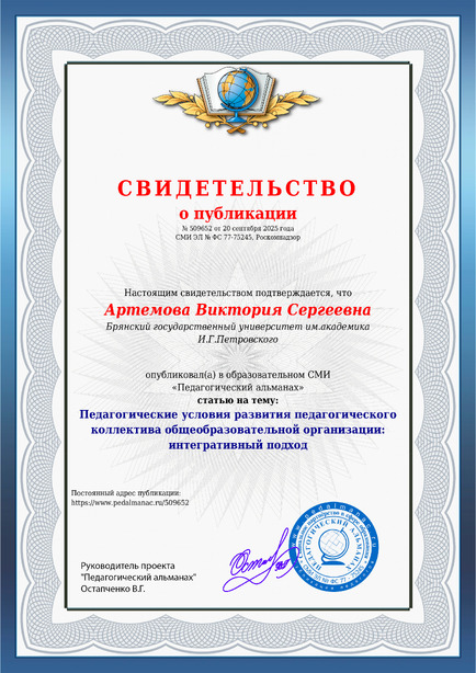 Артемова Виктория Сергеевна Педагогические условия развития педагогического коллектива общеобразовательной организации: интегративный подход / В. С. Артемова. – Текст : электронный // Педагогический альманах : электронное СМИ. - URL: https://www.pedalmanac.ru/509652. - Дата публикации: 20 сентября 2025.