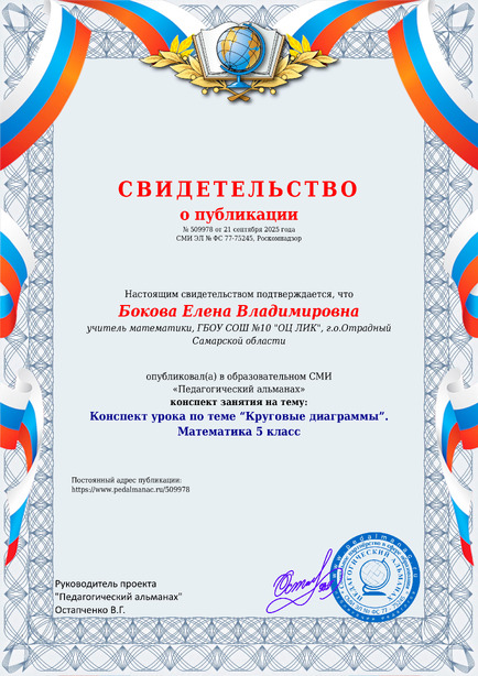 Бокова, Е. В. Конспект урока по теме “Круговые диаграммы”. Математика 5 класс [Электронный ресурс] / Елена Владимировна Бокова // Педагогический альманах : [сайт]. - 2025. - 21 сентября. - [Россия]. - Режим доступа: https://www.pedalmanac.ru/509978, свободный. - Загл. с экрана.