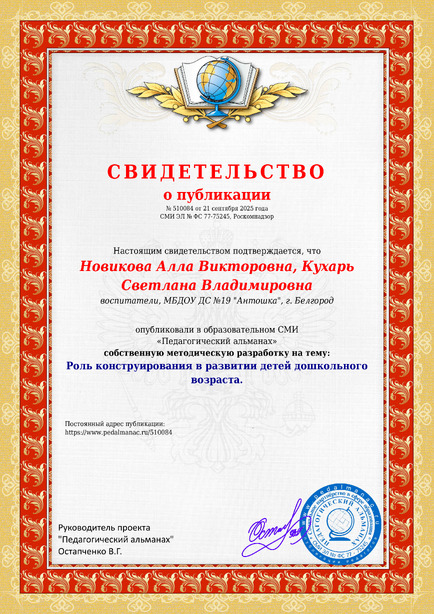 Новикова Алла Викторовна, Кухарь Светлана Владимировна Роль конструирования в развитии детей дошкольного возраста. / А. В. Новикова. – Текст : электронный // Педагогический альманах : электронное СМИ. - URL: https://www.pedalmanac.ru/510084. - Дата публикации: 21 сентября 2025.