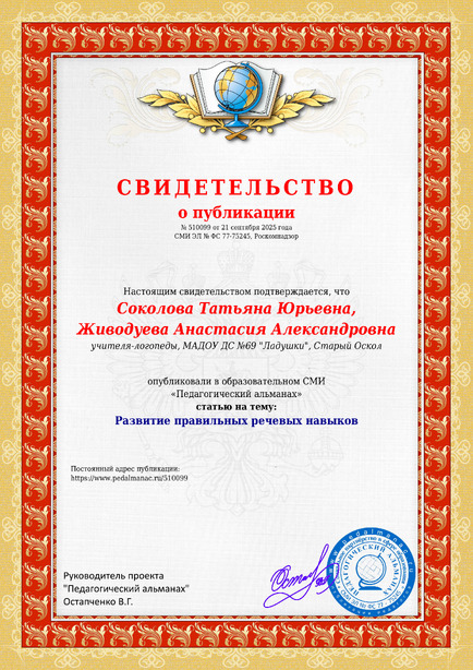 Соколова Татьяна Юрьевна, Живодуева Анастасия Александровна Развитие правильных речевых навыков / Т. Ю. Соколова. – Текст : электронный // Педагогический альманах : электронное СМИ. - URL: https://www.pedalmanac.ru/510099. - Дата публикации: 21 сентября 2025.