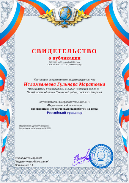 Исламгалеева, Г. М. Российский триколор [Электронный ресурс] / Гульнара Маратовна Исламгалеева // Педагогический альманах : [сайт]. - 2025. - 29 сентября. - [Россия]. - Режим доступа: https://www.pedalmanac.ru/513081, свободный. - Загл. с экрана.