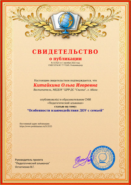 Китайкина Ольга Игоревна “Особенности взаимодействия ДОУ с семьей” / О. И. Китайкина. – Текст : электронный // Педагогический альманах : электронное СМИ. - URL: https://www.pedalmanac.ru/513525. - Дата публикации: 1 октября 2025.
