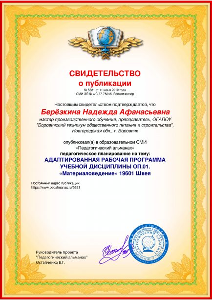 Берёзкина, Н. А. АДАПТИРОВАННАЯ РАБОЧАЯ ПРОГРАММА УЧЕБНОЙ ДИСЦИПЛИНЫ ОП.01. «Материаловедение» 19601 Швея [Электронный ресурс] / Надежда Афанасьевна Берёзкина // Педагогический альманах : [сайт]. - 2019. - 11 июня. - [Россия]. - Режим доступа: https://www.pedalmanac.ru/5321, свободный. - Загл. с экрана.