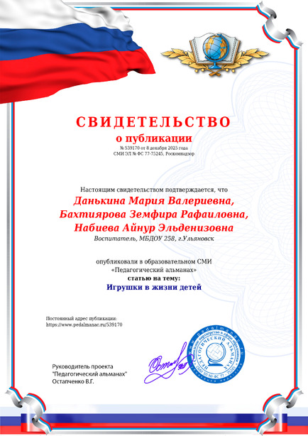 Данькина Мария Валериевна, Бахтиярова Земфира Рафаиловна, Набиева Айнур Эльденизовна Игрушки в жизни детей / М. В. Данькина. – Текст : электронный // Педагогический альманах : электронное СМИ. - URL: https://www.pedalmanac.ru/539170. - Дата публикации: 8 декабря 2025.