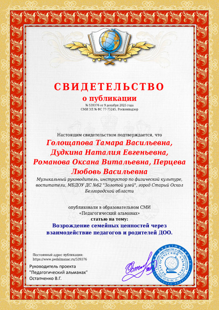 Голощапова Тамара Васильевна, Дудкина Наталия Евгеньевна, Романова Оксана Витальевна, Перцева Любовь Васильевна Возрождение семейных ценностей через взаимодействие педагогов и родителей ДОО. / Т. В. Голощапова. – Текст : электронный // Педагогический альманах : электронное СМИ. - URL: https://www.pedalmanac.ru/539376. - Дата публикации: 9 декабря 2025.