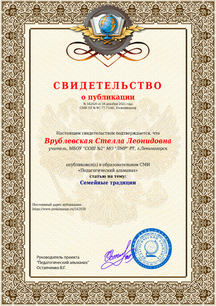 Врублевская Стелла Леонидовна Семейные традиции / С. Л. Врублевская. – Текст : электронный // Педагогический альманах : электронное СМИ. - URL: https://www.pedalmanac.ru/542020. - Дата публикации: 16 декабря 2025.