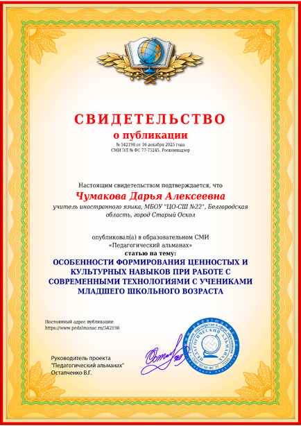 Чумакова Дарья Алексеевна ОСОБЕННОСТИ ФОРМИРОВАНИЯ ЦЕННОСТЫХ И КУЛЬТУРНЫХ НАВЫКОВ ПРИ РАБОТЕ С СОВРЕМЕННЫМИ ТЕХНОЛОГИЯМИ С УЧЕНИКАМИ МЛАДШЕГО ШКОЛЬНОГО ВОЗРАСТА / Д. А. Чумакова. – Текст : электронный // Педагогический альманах : электронное СМИ. - URL: https://www.pedalmanac.ru/542198. - Дата публикации: 16 декабря 2025.