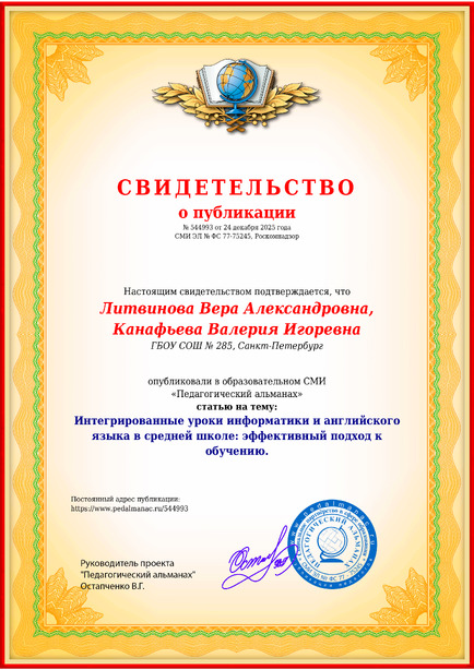 Литвинова Вера Александровна, Канафьева Валерия Игоревна Интегрированные уроки информатики и английского языка в средней школе: эффективный подход к обучению. / В. А. Литвинова. – Текст : электронный // Педагогический альманах : электронное СМИ. - URL: https://www.pedalmanac.ru/544993. - Дата публикации: 24 декабря 2025.