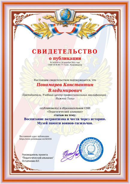 Пономарев Константин Владимирович Воспитание патриотизма и чести через историю. Музей памяти воинов-тагильчан. / К. В. Пономарев. – Текст : электронный // Педагогический альманах : электронное СМИ. - URL: https://www.pedalmanac.ru/545016. - Дата публикации: 24 декабря 2025.