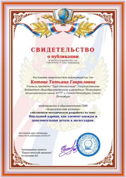 Котова Татьяна Гавриловна Накладной карман, как элемент одежды и дополнительная деталь к аксессуарам. / Т. Г. Котова. – Текст : электронный // Педагогический альманах : электронное СМИ. - URL: https://www.pedalmanac.ru/545139. - Дата публикации: 24 декабря 2025.
