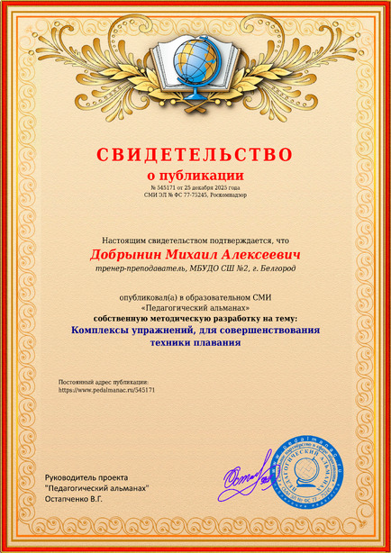 Добрынин Михаил Алексеевич Комплексы упражнений, для совершенствования техники плавания / М. А. Добрынин. – Текст : электронный // Педагогический альманах : электронное СМИ. - URL: https://www.pedalmanac.ru/545171. - Дата публикации: 25 декабря 2025.