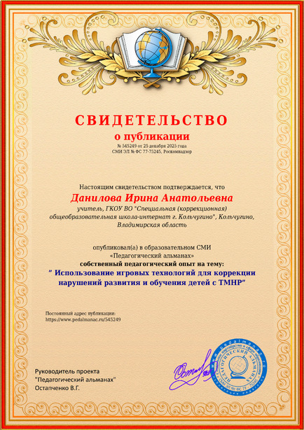 Данилова Ирина Анатольевна ” Использование игровых технологий для коррекции нарушений развития и обучения детей с ТМНР” / И. А. Данилова. – Текст : электронный // Педагогический альманах : электронное СМИ. - URL: https://www.pedalmanac.ru/545249. - Дата публикации: 25 декабря 2025.