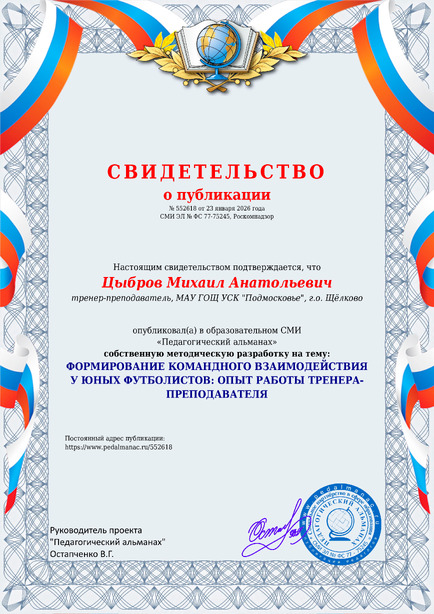Цыбров Михаил Анатольевич ФОРМИРОВАНИЕ КОМАНДНОГО ВЗАИМОДЕЙСТВИЯ У ЮНЫХ ФУТБОЛИСТОВ: ОПЫТ РАБОТЫ ТРЕНЕРА-ПРЕПОДАВАТЕЛЯ / М. А. Цыбров. – Текст : электронный // Педагогический альманах : электронное СМИ. - URL: https://www.pedalmanac.ru/552618. - Дата публикации: 23 января 2026.