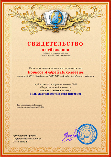 Борисов Андрей Николаевич Виды деятельности в сети Интернет / А. Н. Борисов. – Текст : электронный // Педагогический альманах : электронное СМИ. - URL: https://www.pedalmanac.ru/554264. - Дата публикации: 29 января 2026.