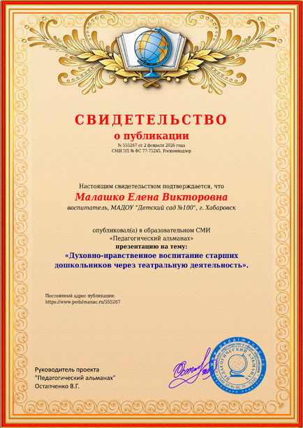 Малашко Елена Викторовна «Духовно-нравственное воспитание старших дошкольников через театральную деятельность». / Е. В. Малашко. – Текст : электронный // Педагогический альманах : электронное СМИ. - URL: https://www.pedalmanac.ru/555267. - Дата публикации: 2 февраля 2026.