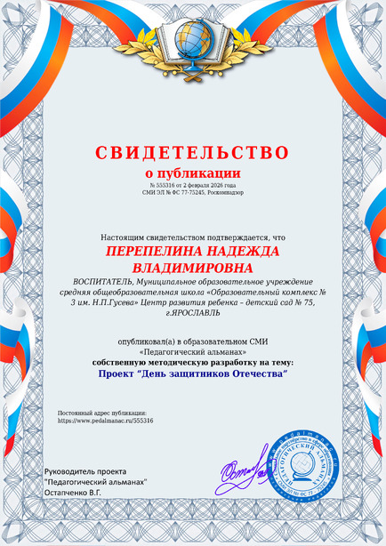 ПЕРЕПЕЛИНА НАДЕЖДА ВЛАДИМИРОВНА Проект “День защитников Отечества” / Н. В. ПЕРЕПЕЛИНА. – Текст : электронный // Педагогический альманах : электронное СМИ. - URL: https://www.pedalmanac.ru/555316. - Дата публикации: 2 февраля 2026.