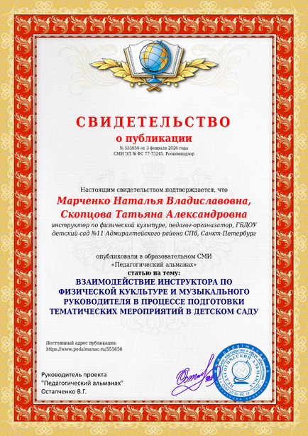Марченко Наталья Владиславовна, Скопцова Татьяна Александровна ВЗАИМОДЕЙСТВИЕ ИНСТРУКТОРА ПО ФИЗИЧЕСКОЙ КУКЛЬТУРЕ И МУЗЫКАЛЬНОГО РУКОВОДИТЕЛЯ В ПРОЦЕССЕ ПОДГОТОВКИ ТЕМАТИЧЕСКИХ МЕРОПРИЯТИЙ В ДЕТСКОМ САДУ / Н. В. Марченко. – Текст : электронный // Педагогический альманах : электронное СМИ. - URL: https://www.pedalmanac.ru/555656. - Дата публикации: 3 февраля 2026.