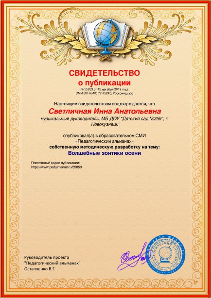 Светличная Инна Анатольевна Волшебные зонтики осени / И. А. Светличная. – Текст : электронный // Педагогический альманах : электронное СМИ. - URL: https://www.pedalmanac.ru/55853. - Дата публикации: 15 декабря 2019.