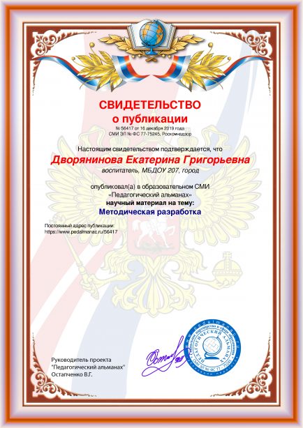 Дворянинова Екатерина Григорьевна Методическая разработка / Е. Г. Дворянинова. – Текст : электронный // Педагогический альманах : электронное СМИ. - URL: https://www.pedalmanac.ru/56417. - Дата публикации: 16 декабря 2019.