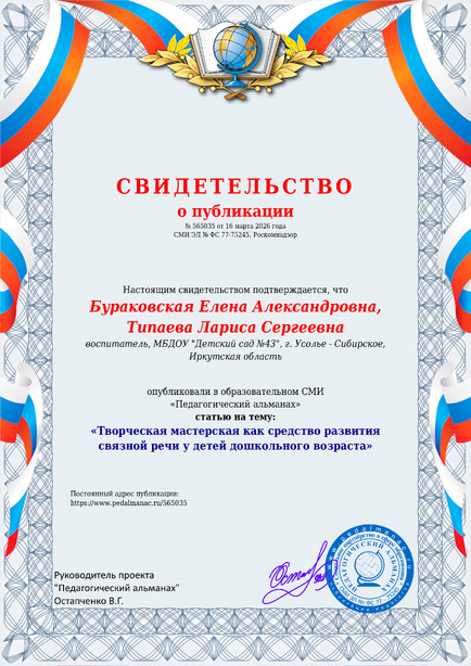 Бураковская Елена Александровна, Типаева Лариса Сергеевна «Творческая мастерская как средство развития связной речи у детей дошкольного возраста» / Е. А. Бураковская. – Текст : электронный // Педагогический альманах : электронное СМИ. - URL: https://www.pedalmanac.ru/565035. - Дата публикации: 16 марта 2026.