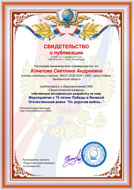 После оплаты Вам моментально предоставляется именное «Свидетельство о публикации» и «Справка о публикации материала в СМИ»В соответствии с пп. 36, 37 Приказа Минобрнауки РФ №276 «Об утверждении Порядка проведения аттестации педагогических работников» является подтверждением транслирования в педагогических коллективах опыта практических результатов своей профессиональной деятельности, в том числе экспериментальной и инновационной. установленного образца в печатном качестве, которые Вы можете приложить к портфолио и предъявить при прохождении аттестации.